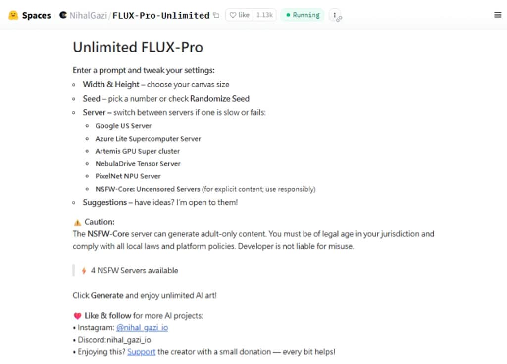 該工具內建多種伺服器選項,包含 Google US Server、Azure Lite Supercomputer、Artemis GPU Super Cluster、PixelNet NPU Server 等,若遇速度不佳可隨時切換;此外也提供 NSFW-Core(未經審查內容) 伺服器,允許創作成人限定圖像,但使用前須確認符合當地法律與平台政策。整體而言,Unlimited FLUX-Pro 提供高度自由的 AI 生成環境,無論用於概念藝術、靈感發想或內容創作都十分方便。
