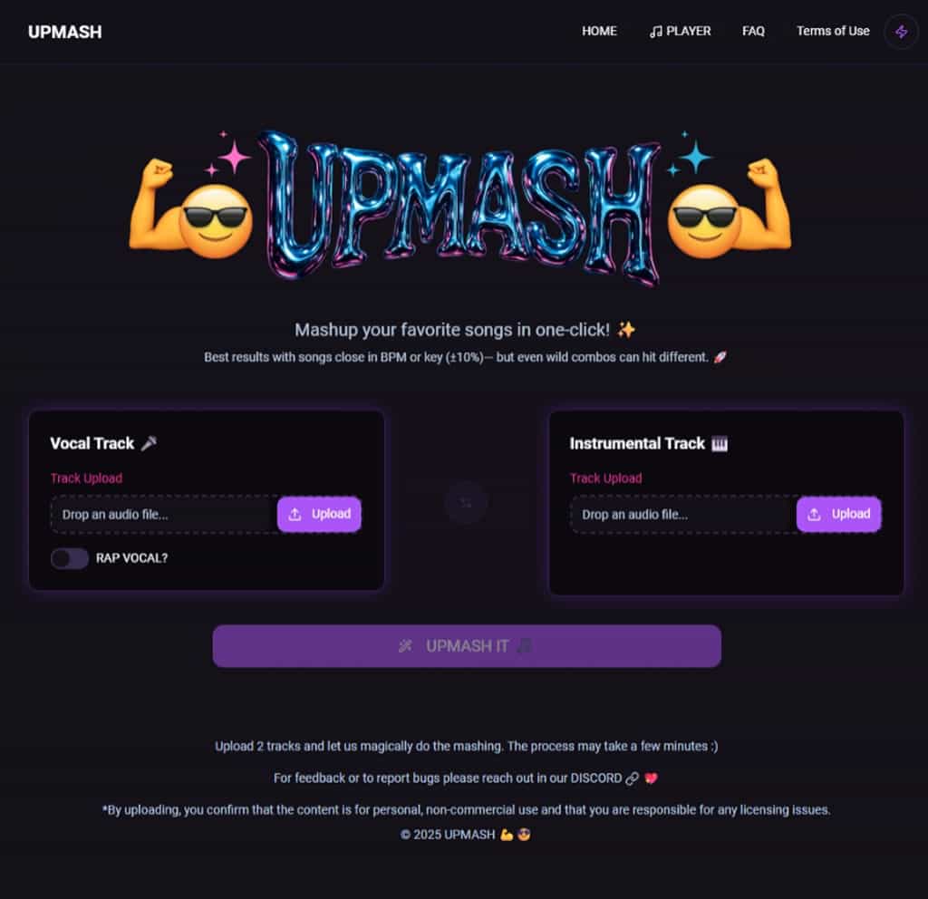 UPMASH 支援多種常見音訊格式(如 MP3、WAV 等),介面簡單直覺,不需要懂調性或 BPM 對齊也沒關係。當然,如果你想創作效果更好的 mashup,建議選擇節奏和調性相近的兩首歌(±10% BPM 和相近 Key 效果最佳)。若混音聽起來怪怪的,也可以嘗試交換主副歌曲、調整來源品質,讓創作更貼耳。