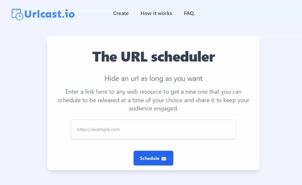 URLcast.io 是一個讓使用者自行設定網址公開瀏覽時間的線上工具,它將縮網址與網址轉址結合成為一個免費服務。使用者可以將未公開的網址通過 URLcast.io 生成短網址,並自訂該網址的未來公開瀏覽時間。當設定的時間到達時,瀏覽該短網址的使用者將自動轉址到指定的網頁。因此,如果有活動訊息需要在特定時間公布,可以試試 URLcast.io。使用該服務無需註冊,且無使用次數限制。