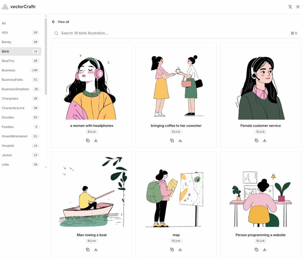 VectorCraftr 是一個專門提供 SVG 插圖的免費圖庫網站,涵蓋 404、Bendy、Blink、Business、Lovers、Zoo 等 28 種分類,使用者可依分類快速瀏覽,輕鬆找到適合的插圖素材。網站提供兩種下載方式:直接下載 SVG 檔案或複製 SVG 程式碼,無論是網頁設計、UI/UX 設計、簡報製作或社群貼文,都能輕鬆應用。VectorCraftr 提供的所有素材可自由用於個人與商業用途,且無需註冊,無任何下載限制,完全免費。