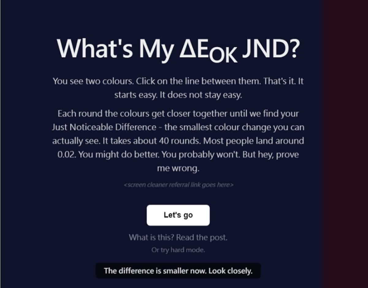 首頁線上工具圖片處理 挑戰人眼極限:「What's My JND」幫你找出色彩感知臨界值 你有沒有想過,自己的眼睛到底能分辨多細微的顏色差異?這次要介紹的,是一款由前端開發者 Keith Cirkel 製作的免費互動測驗工具,What's My JND,它能用一場簡單的視覺遊戲,幫你找出屬於你個人的「最小可感色差」臨界值。這個工具完全免費、免安裝,直接在瀏覽器就能玩,對設計師、前端工程師、或是單純好奇自己眼力的人來說,都是一個很有意思的體驗。 相關文章還在為找圖床煩惱?ImgTok 一站解決你的圖片影片儲存困擾黑白照片秒變彩色!Google Gemini 打造的 GPhoto Remaster 免費修復工具自製專屬著色本:用 Gemini 著色畫產生器把任何圖片或提示詞變成黑白線條圖Gemini 浮水印一鍵移除!Gemini Watermark Remover 免費極速無損本地處理解鎖 Nano Banana Pro 潛力:YouMind 精選提示詞範例庫