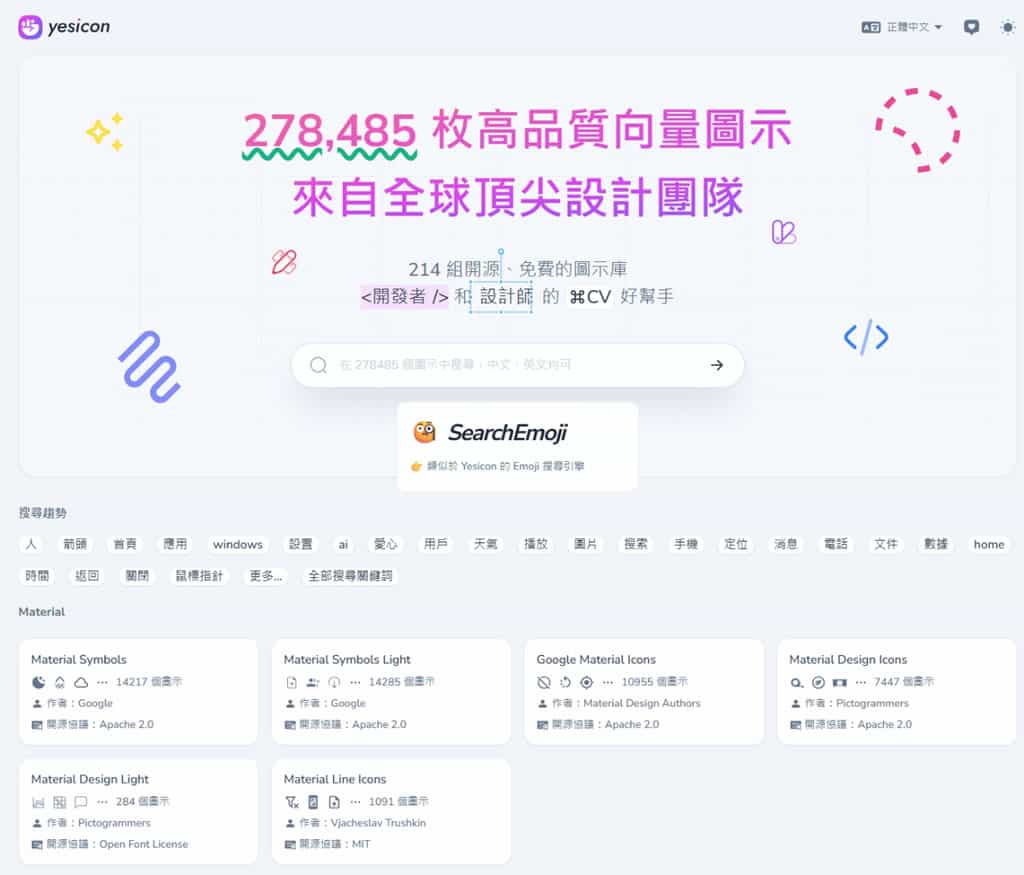 yesicon 是一個專為開發者和設計師打造的精選向量圖示平台,基於知名開源專案 Iconify 框架開發,匯集了全球 194 個圖示集中超過 25 萬個高品質開源向量圖示。作為目前規模最大的免費圖示資源庫之一,yesicon 不僅提供友善的中文操作介面,更支援多語言關鍵字搜尋功能,讓使用者能夠快速找到所需的視覺元素。平台整合了從箭頭、建築、商業、通信到設計開發等十多種分類的圖示資源,並提供填充、線條、圓形、粗體、徽章、圓角等多樣化風格選擇,完美滿足各種專案的視覺設計需求。