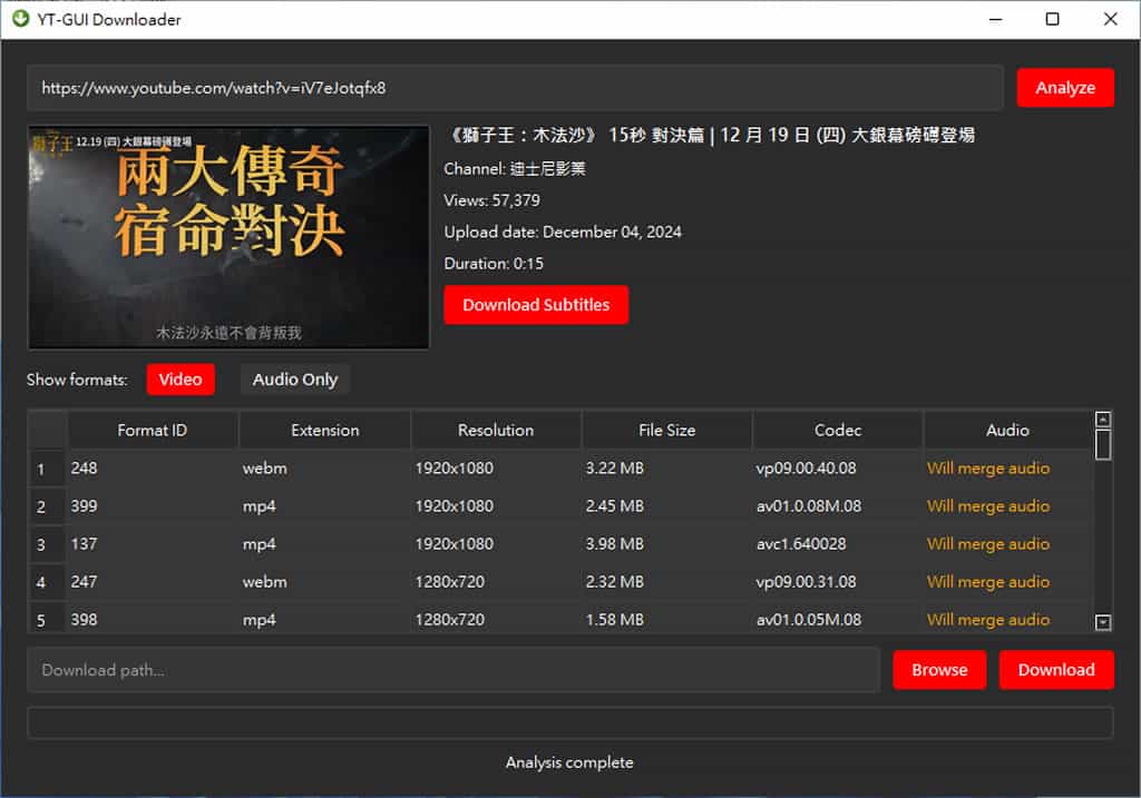 4.輸入要下載的 YouTube 影片網址後,按「Analyze」就會得到該影片的觀看數、上傳日期、持續時間等資訊,也可以點擊「Download Subtitles」下載該影片字幕檔。