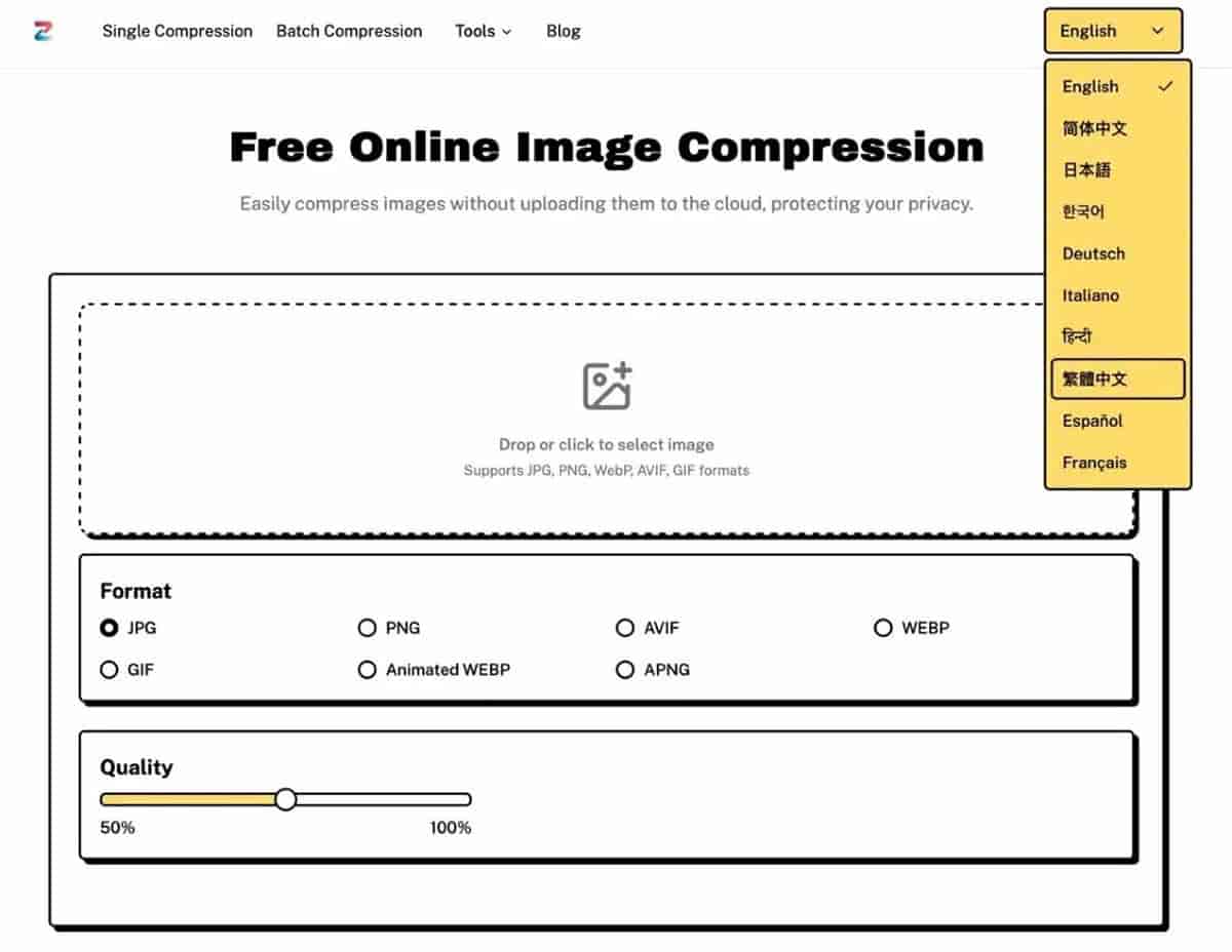 1.進入 ZipPic 官網,網站本身提供多語言介面,可以先切換成繁體中文介面,使用更順手。